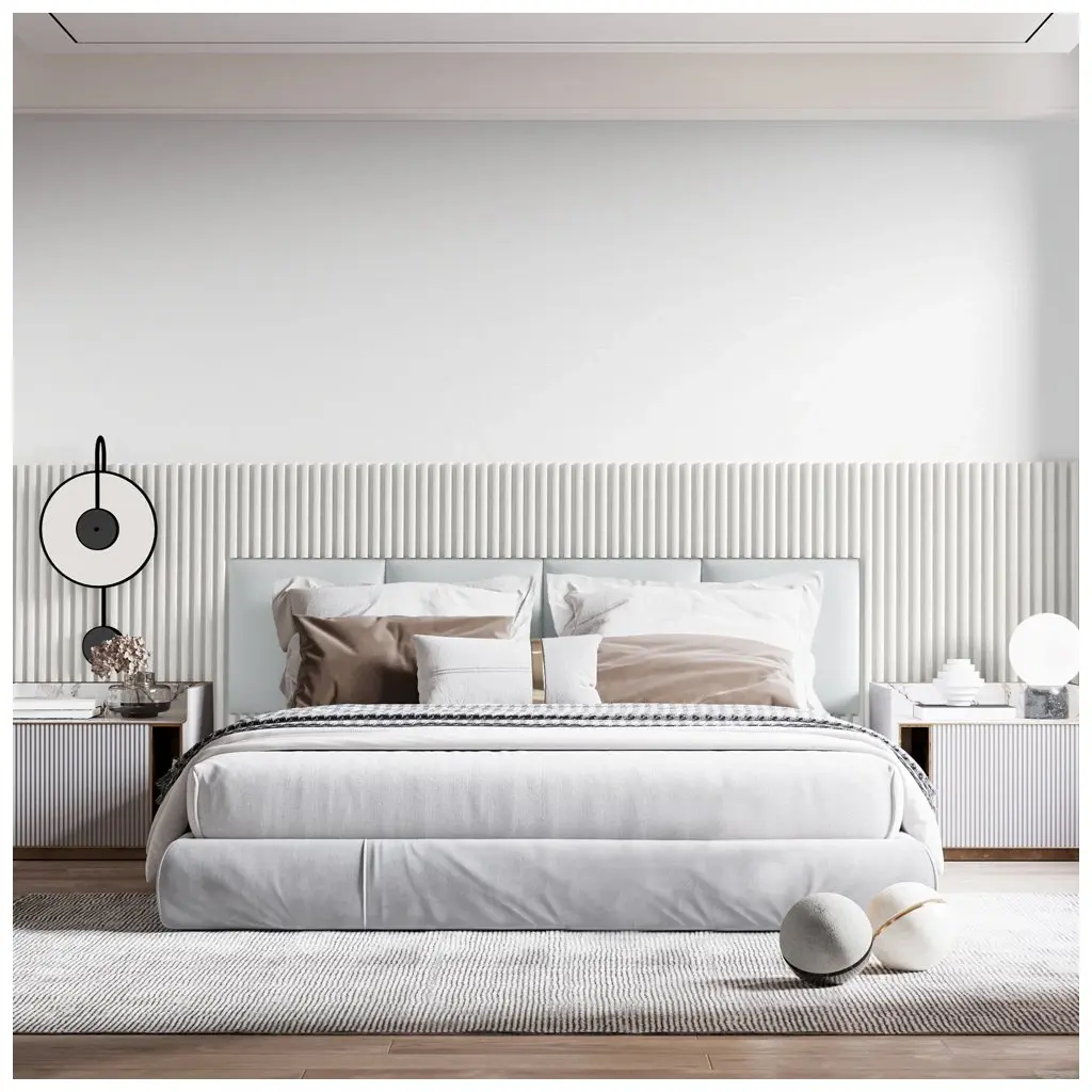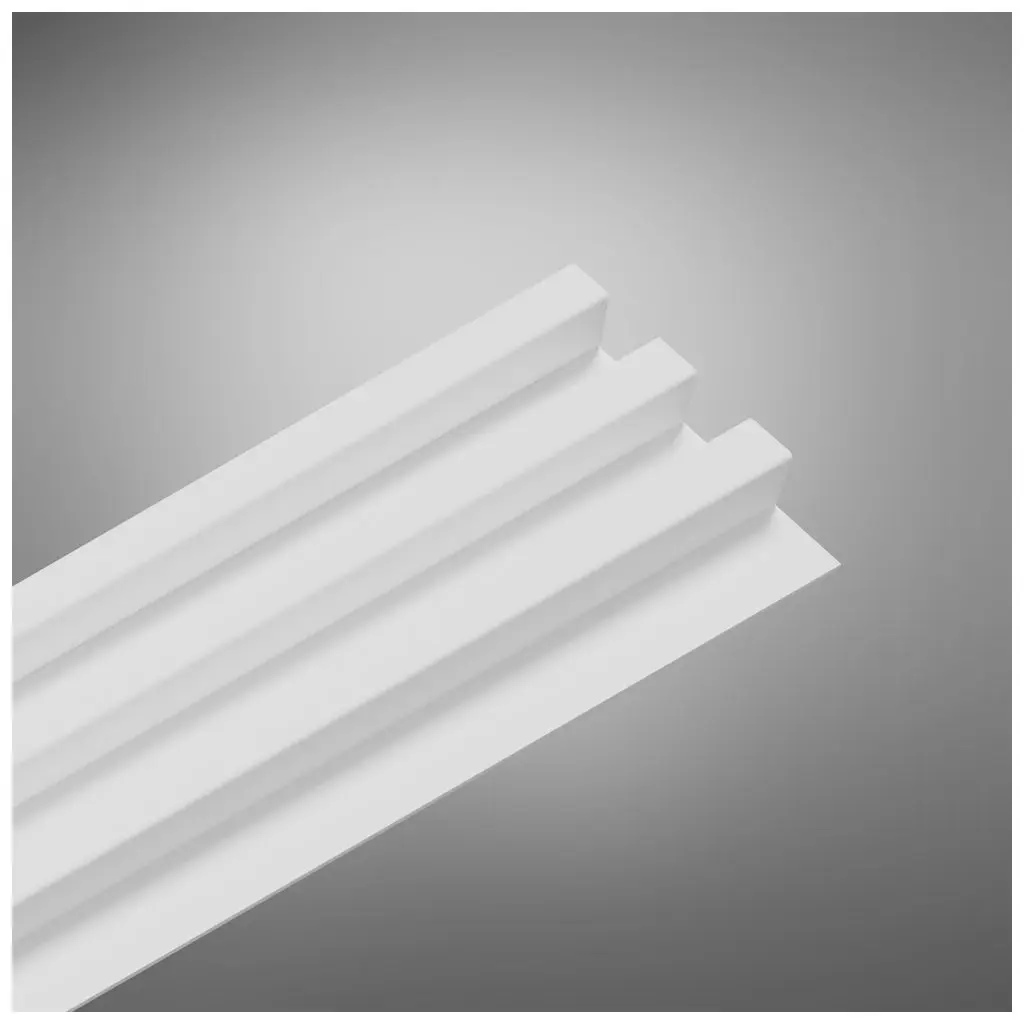 Tri biele lamely na bielom podklade s rozmermi 2650 × 150 × 30 mm, ktoré sa hodia do moderných interiérov.Lamely sú vyrobené z MDF, potiahnuté PVC fóliou a pripevnené k HDF doske s hrúbkou 3 mm.